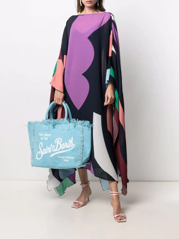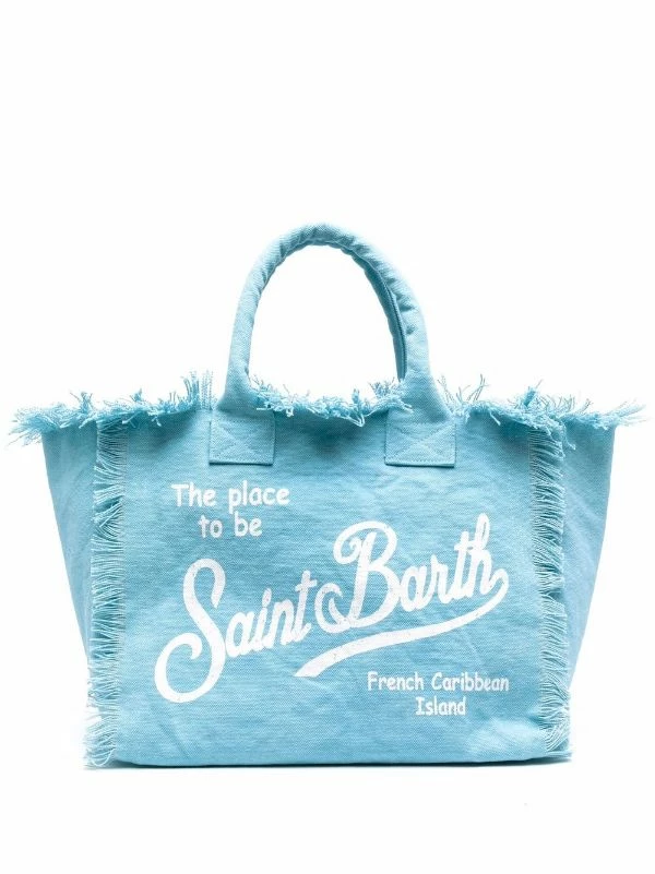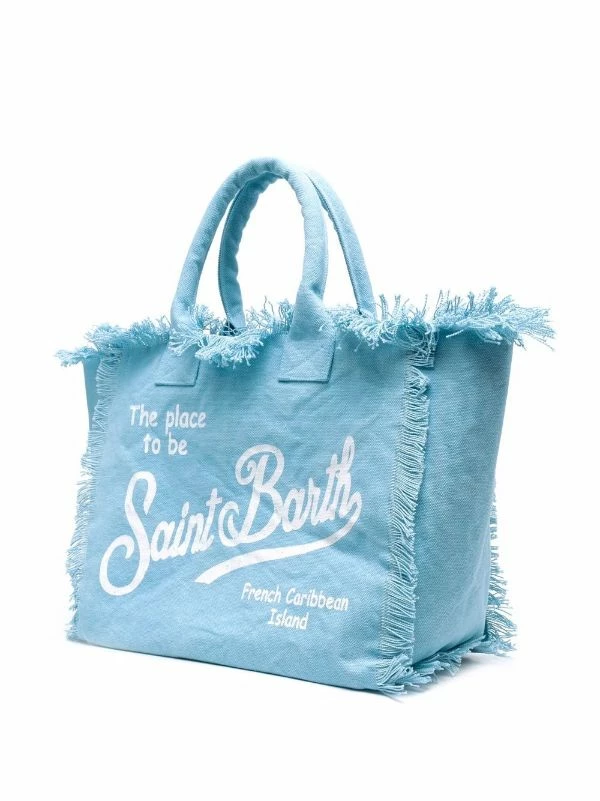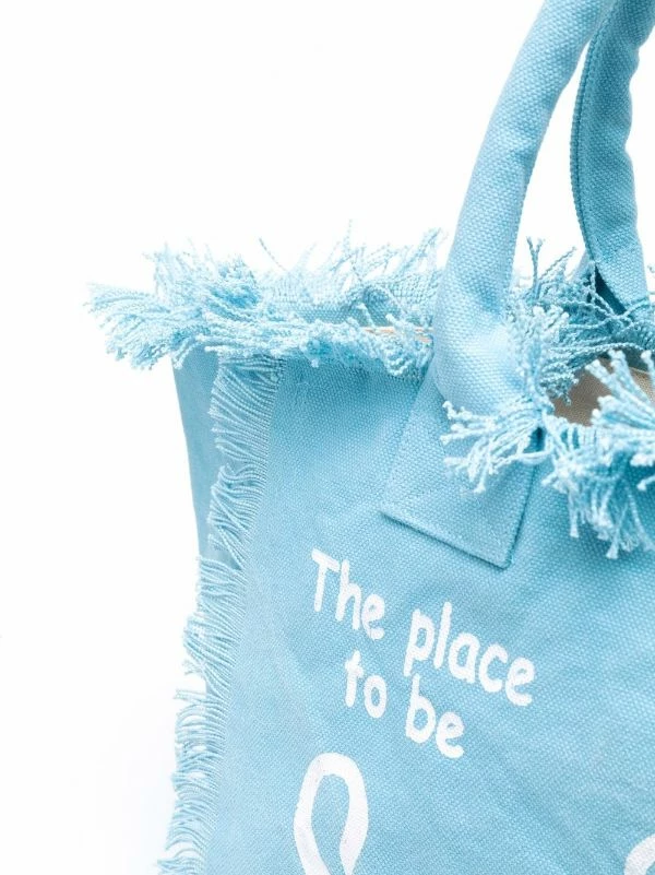 Logo-Print vorne, ausgefranste Kanten, zwei runde Henkel, Reißverschluss oben, Hauptfach, Reißverschlusstasche innen. Material: Baumwolle.