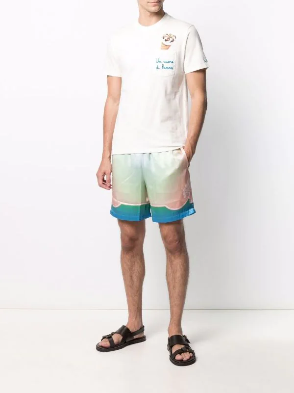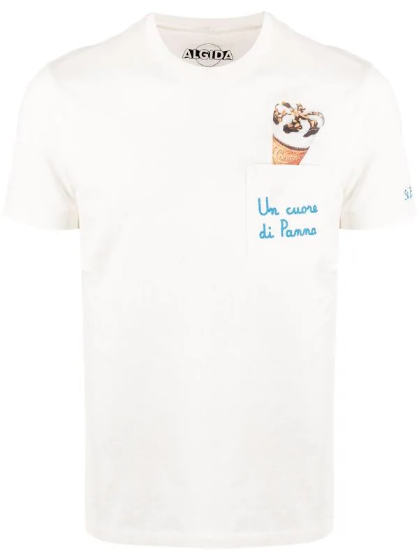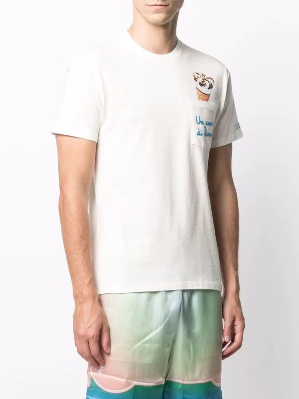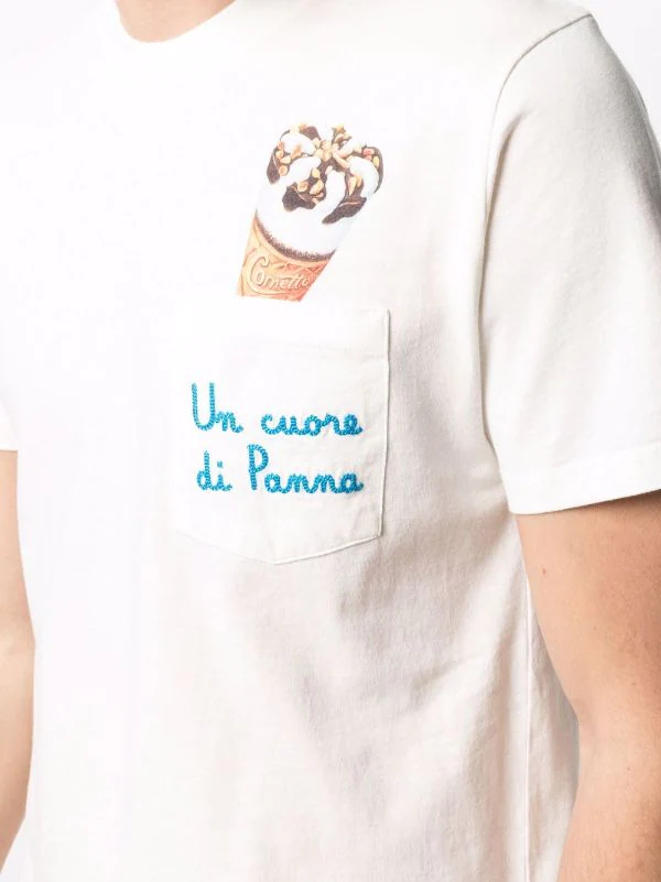 Grafischer Print, Slogan-Stickerei, runder Ausschnitt, kurze Ärmel, aufgesetzte Brusttasche, gerader Saum. Material: Baumwolle.