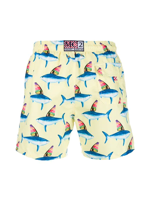 Badeshorts mit Hai-Print von MC2 SAINT BARTH. Merkmale: elastischer Bund mit Kordelzug, seitliche Taschen, aufgesetzte Gesäßtasche, Logo-Patch hinten und kurzer Schnitt.