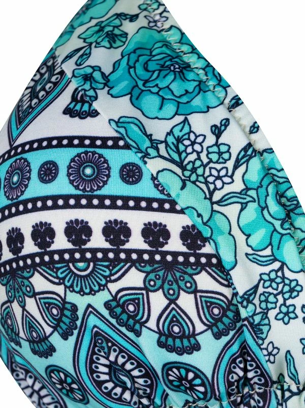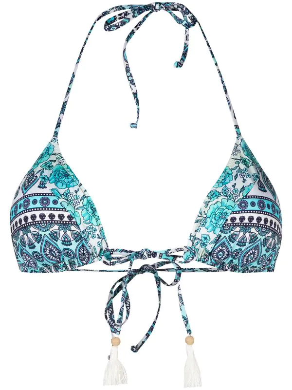 Grafischer Print, Triangel-Design, Schleifenverschluss hinten, Schleifendetails. Farbe: Blau. Swimwear darf nur über Ihrer eigenen Unterwäsche anprobiert werden.