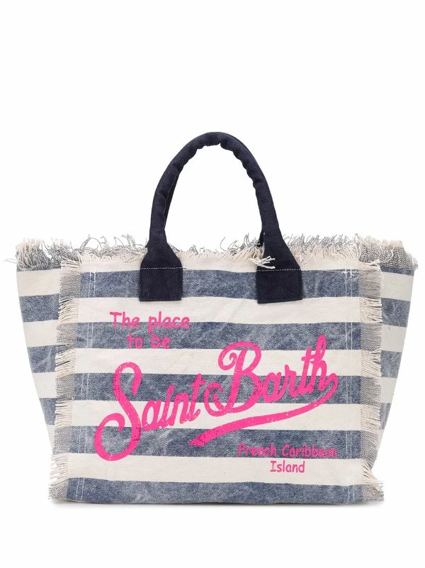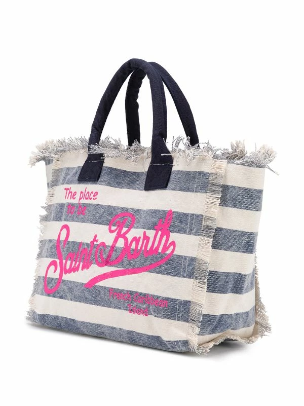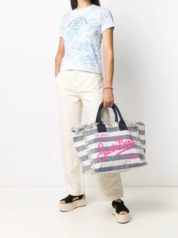 Gestreift, ausgefranste Details, Logo-Print hinten, zwei Henkel, Reißverschluss oben. Material: Baumwolle.
