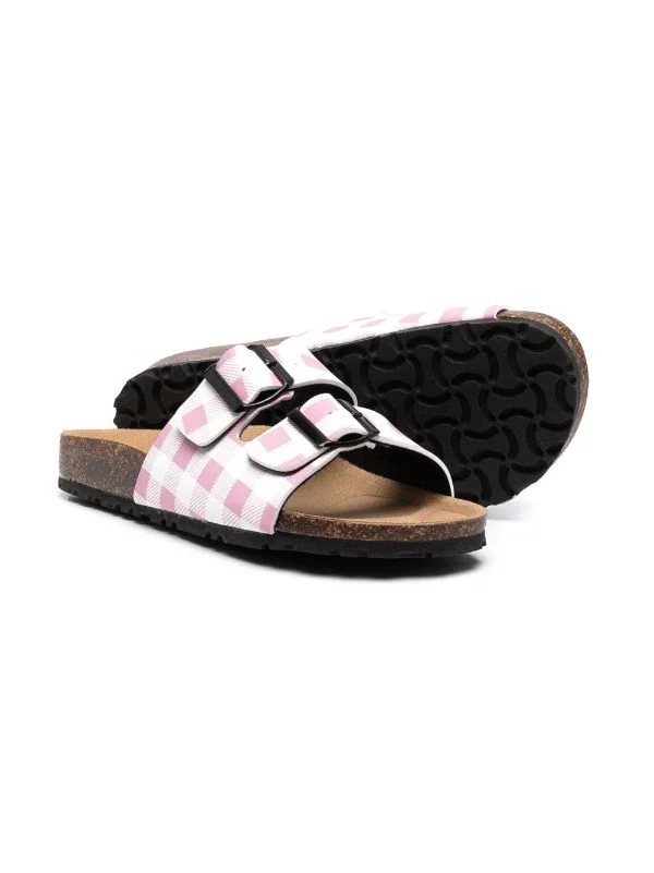 Vichy-Karo, Zierschnalle, zehenfrei, Lederinnensohle mit Logo-Prägung, flache Gummisohle.