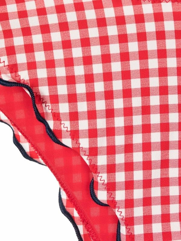 Hellrot, Wollweiß, Schwarz, Stretch-Design, Vichy-Karo, Rüschensaum , tiefe Taille, Schleifenverschluss an der Seite. Swimwear kann nur über Ihrer eigenen Unterwäsche anprobiert werden. Taucherbrille und Schnorchel sind optional….