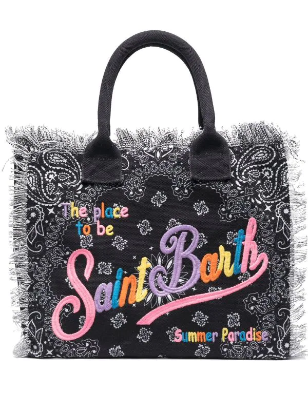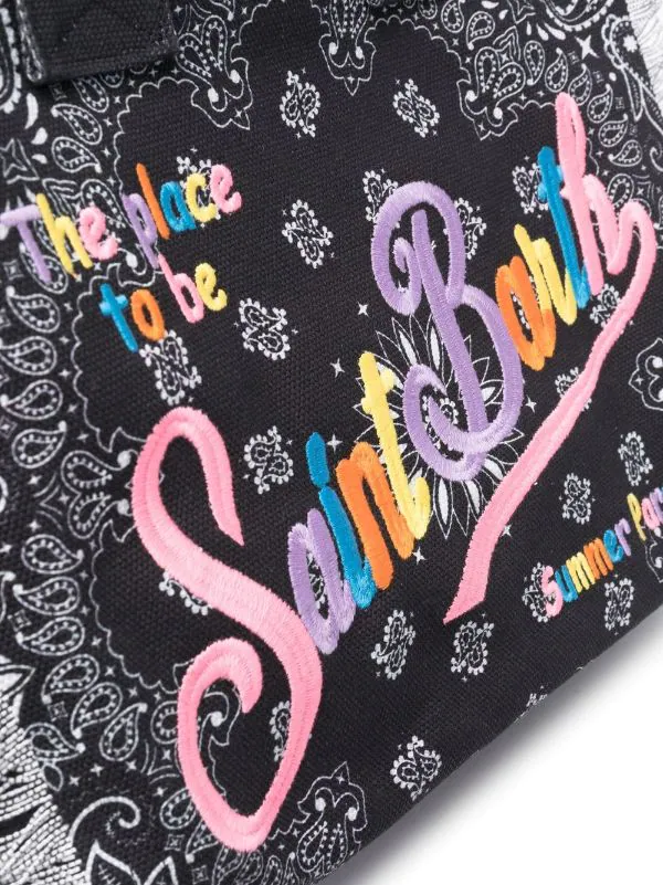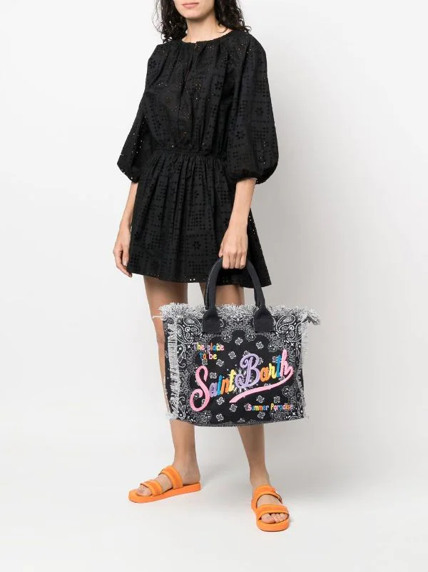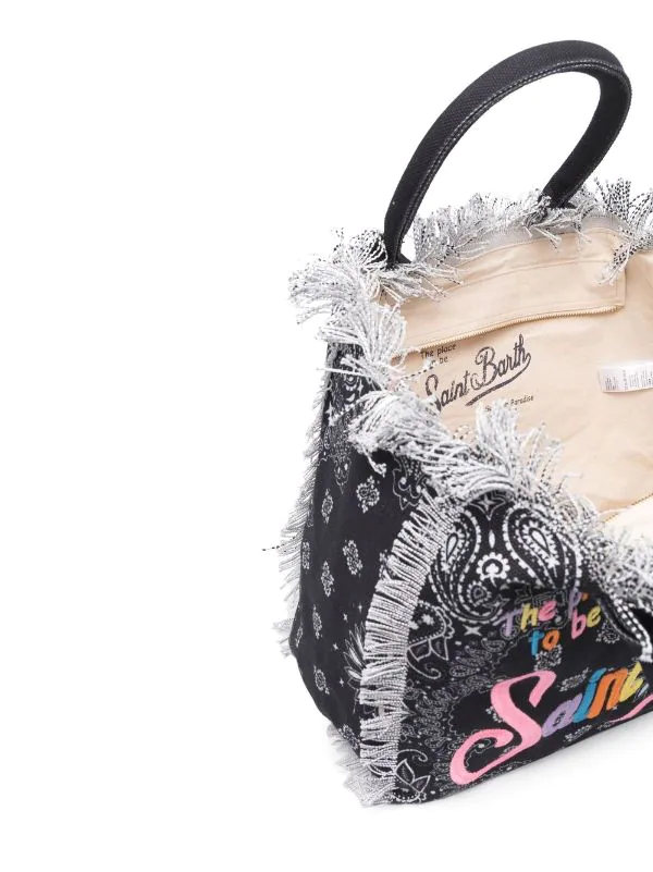Baumwolle, Schwarz, Bandana-Print, ausgefranste Kanten, zwei Henkel, oben offen.