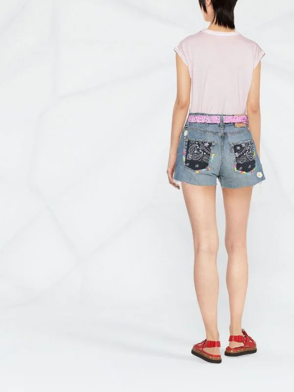 Mittlere Waschung, Bandana-Print, Blumenapplikationen , verdeckter Verschluss vorne, gegurtete Taille, Five-Pocket-Design, oberschenkellang.