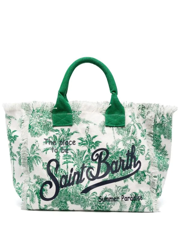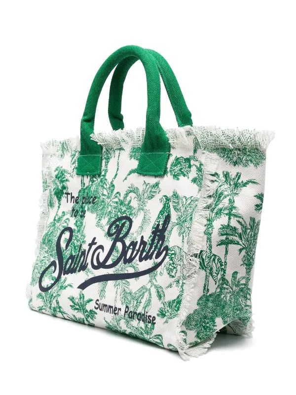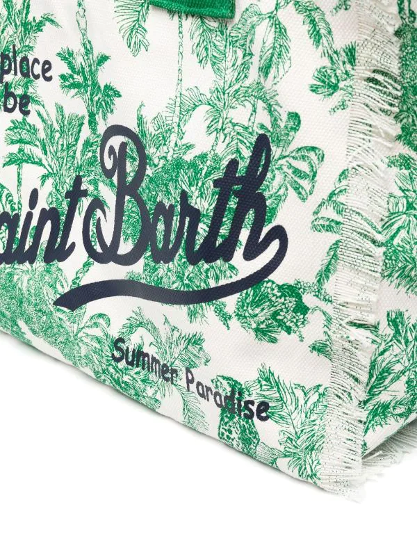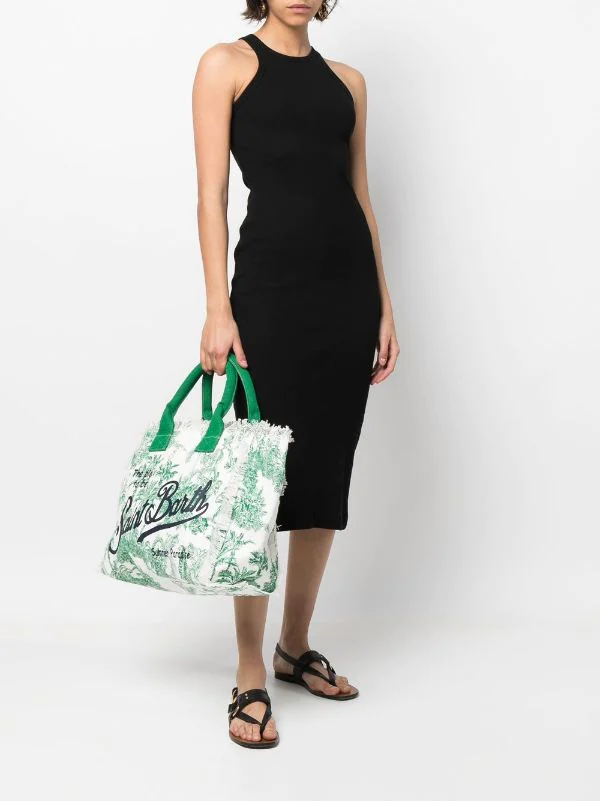 Botanischer Print, Logo-Print vorne, Reißverschluss oben, zwei runde Henkel, Hauptfach, komplett gefüttert.