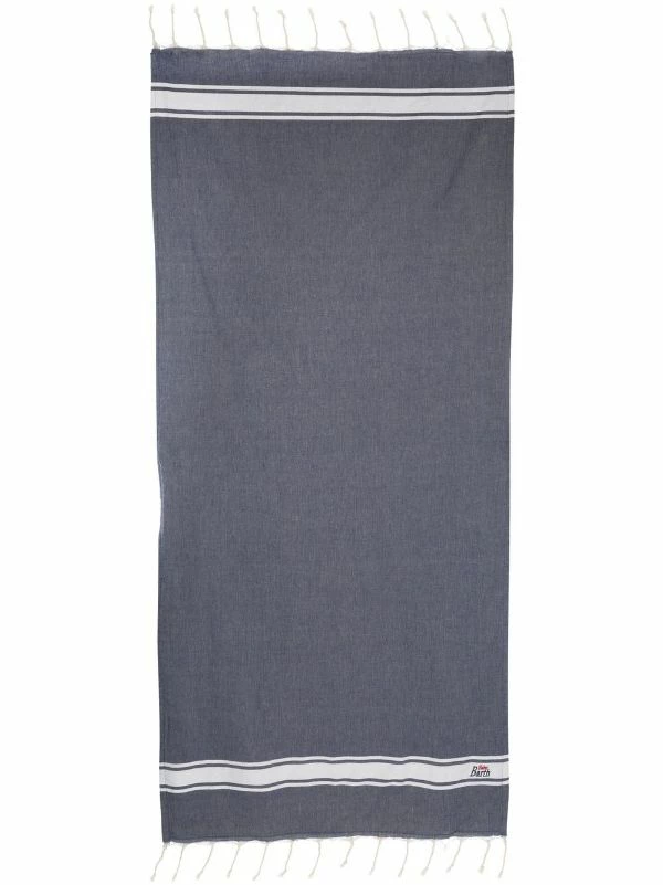 fringe-detail beach towel from MC2 SAINT BARTH featuring navy blue, cotton, horizontal stripe pattern and fringe detailing.