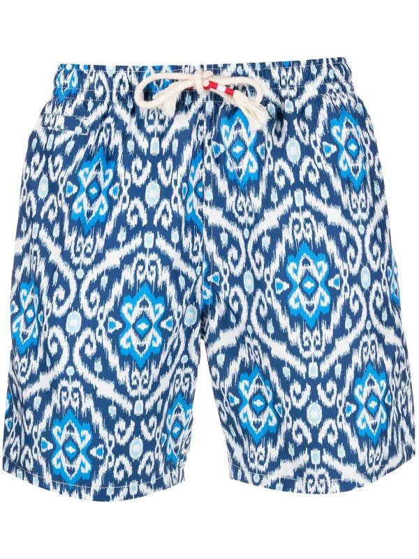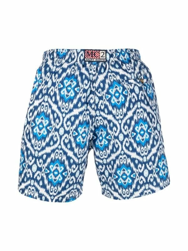 grpahic-print swim shorts from MC2 SAINT BARTH featuring blue, white, recycled polyester, all-over graphic print, logo patch to the rear, drawstring fastening waist and straight leg. Be mindful to try on swimwear over your own garments.. POSITIVELY CONSCIOUS: This Planet Conscious product is crafted from certified recycled or upcycled materials, which helps you make a better choice for the environment as they generate less energy, save water and reduce the need for new raw materials. For recycled synthetic clothing products we highly recommend using a microfibre-catching washing bag to ensure that no microplastics that can pollute water are released in the process..