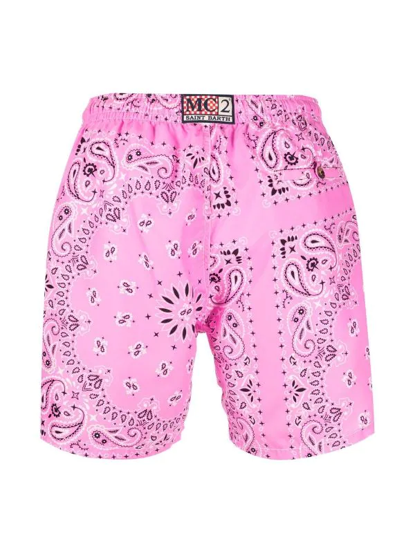 bandana-print swim shorts from MC2 SAINT BARTH featuring pink, recycled polyamide, bandana print, logo patch to the rear, drawstring fastening waist and straight leg. Be mindful to try on swimwear over your own garments..