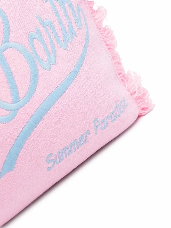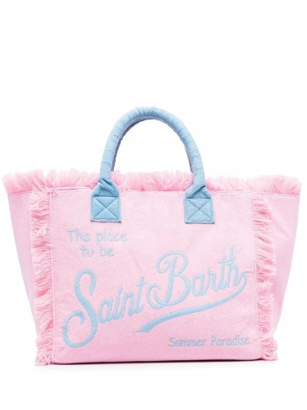 Hellpink, Hellblau, Baumwolle, bestickt, ausgefranster Saum, Reißverschluss oben, zwei runde Henkel, Hauptfach.