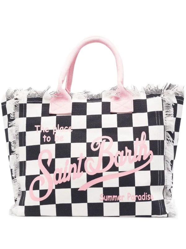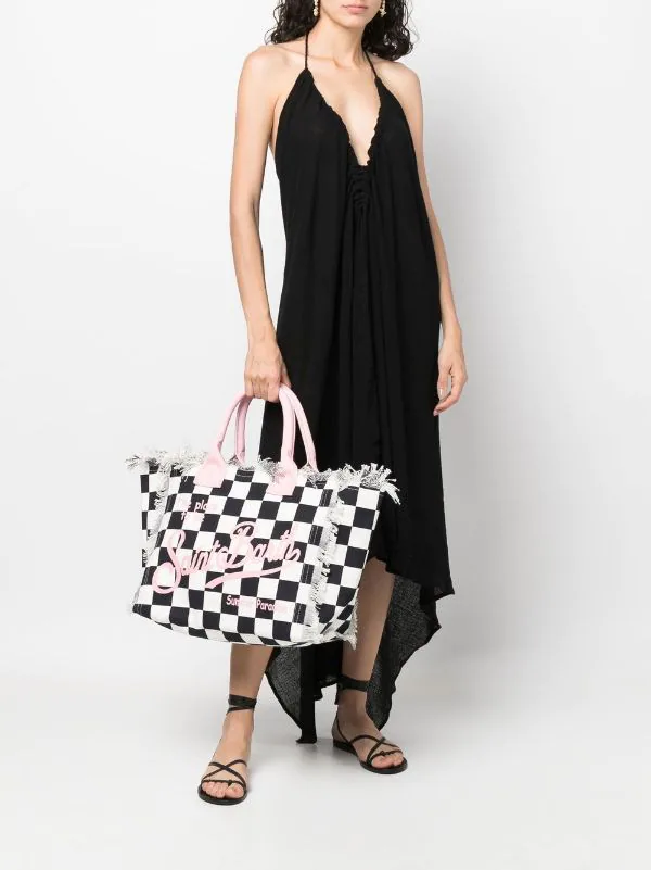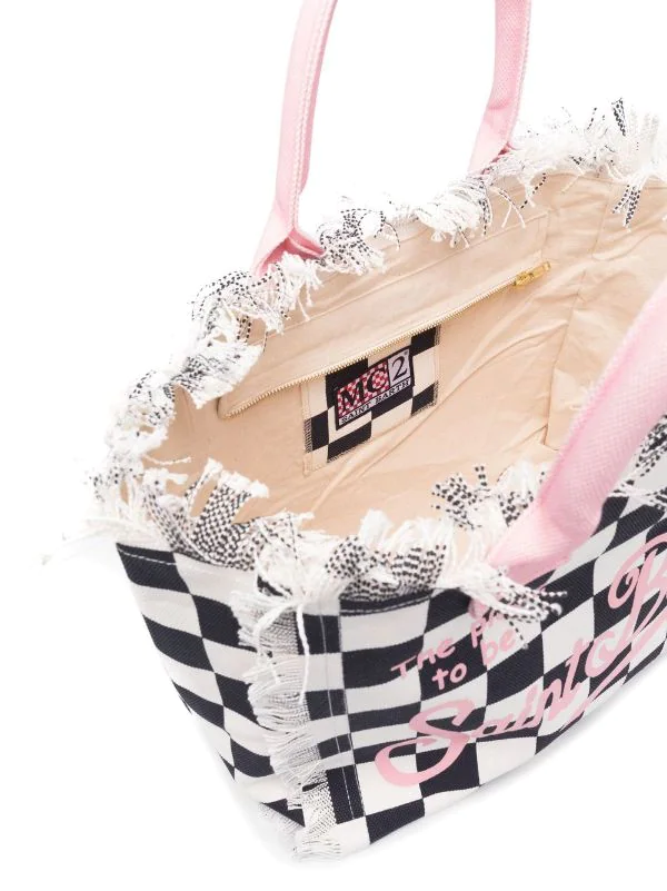 Marineblau, Weiß, Baumwolle, Karomuster, Logo-Print vorne, ausgefranste Kanten, zwei Henkel, Reißverschluss oben, Logo-Patch an der Innenseite.
