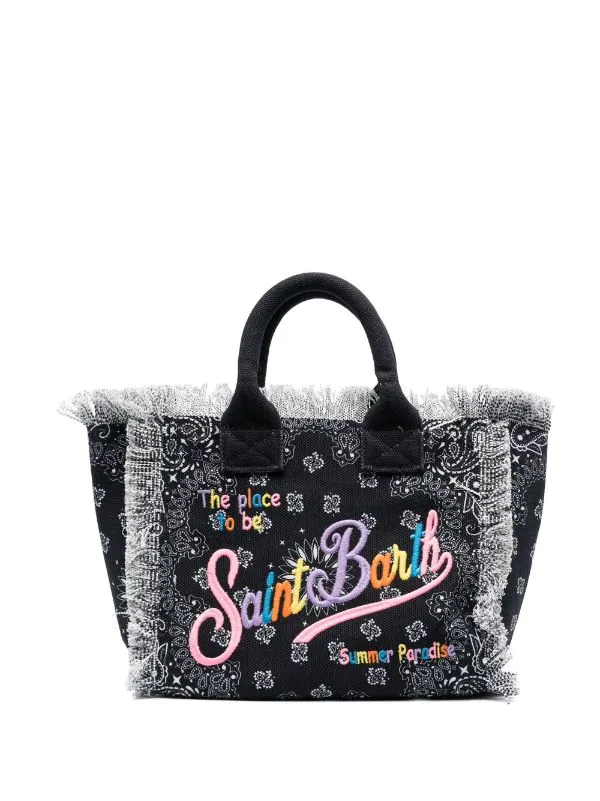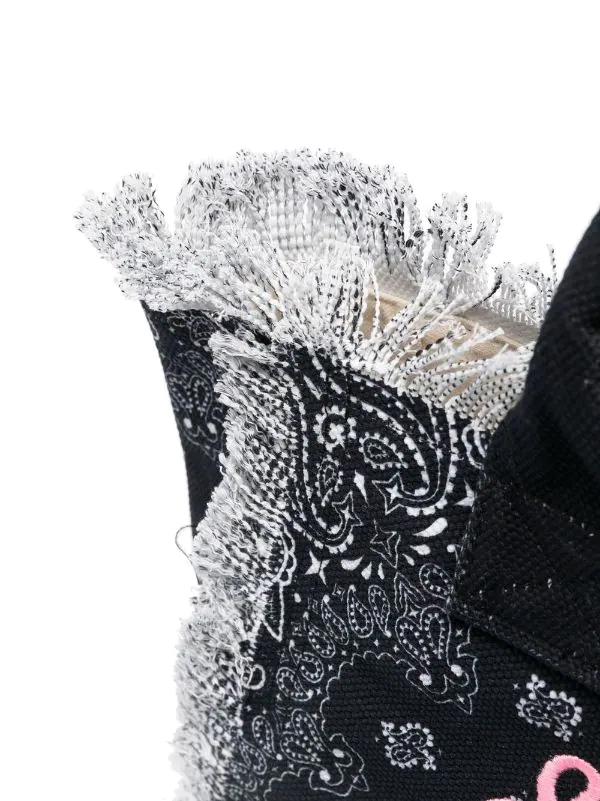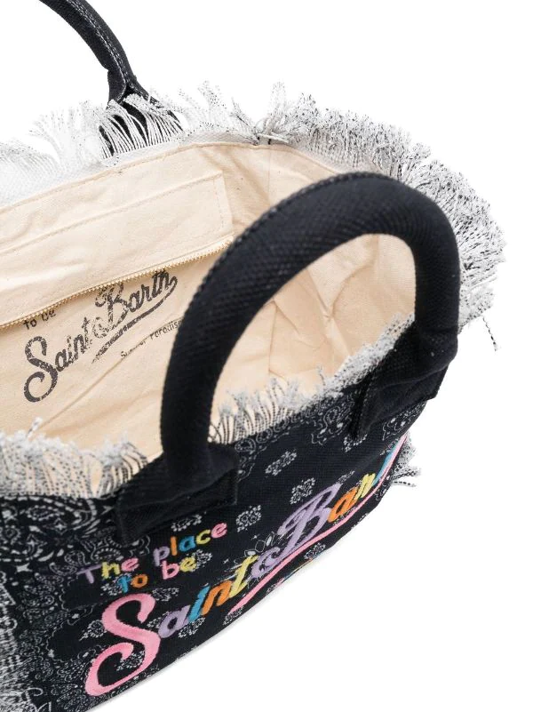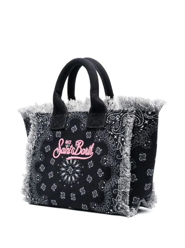 Schwarz/Bunt, Baumwolle, Bandana-Print, Logo-Stickerei vorne, ausgefranster Saum, zwei runde Henkel, Reißverschluss oben, Hauptfach, komplett gefüttert.