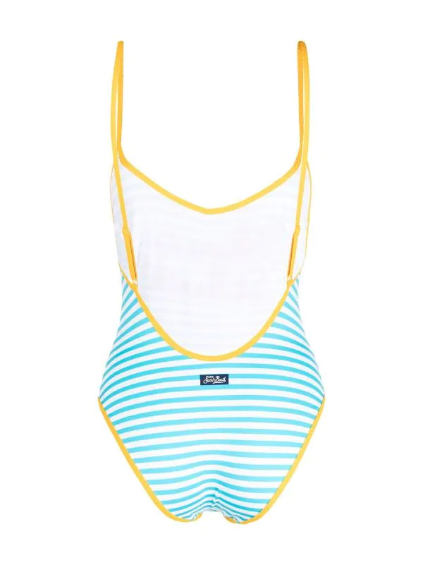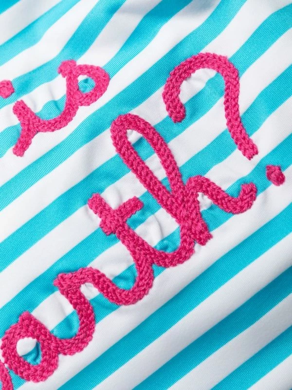 embroidered striped swimsuit from MC2 SAINT BARTH featuring multicolour, horizontal stripe pattern, embroidered slogan, round neck, spaghetti straps, low back and stretch-design. Be mindful to try on swimwear over your own garments..