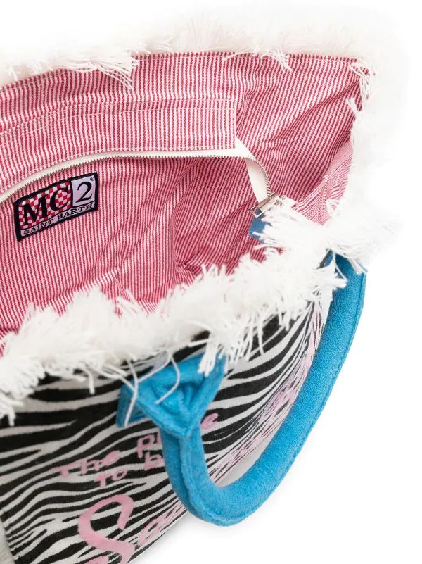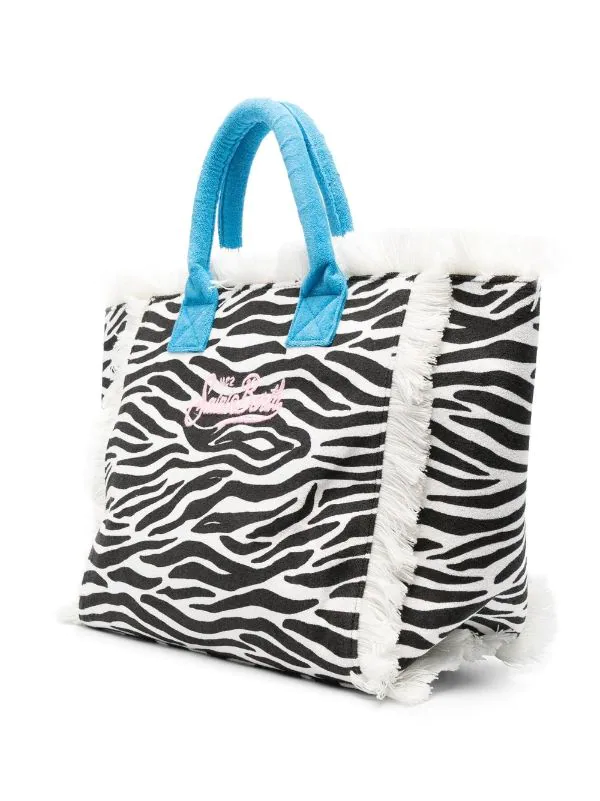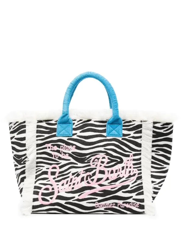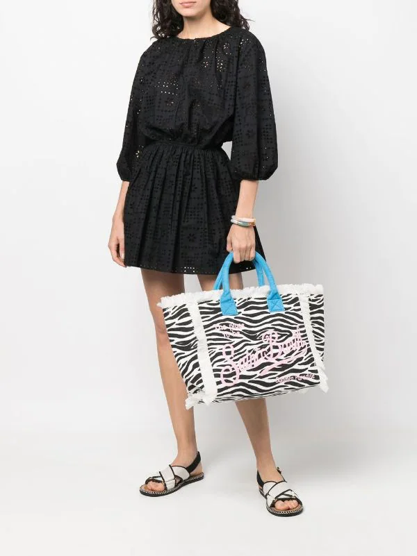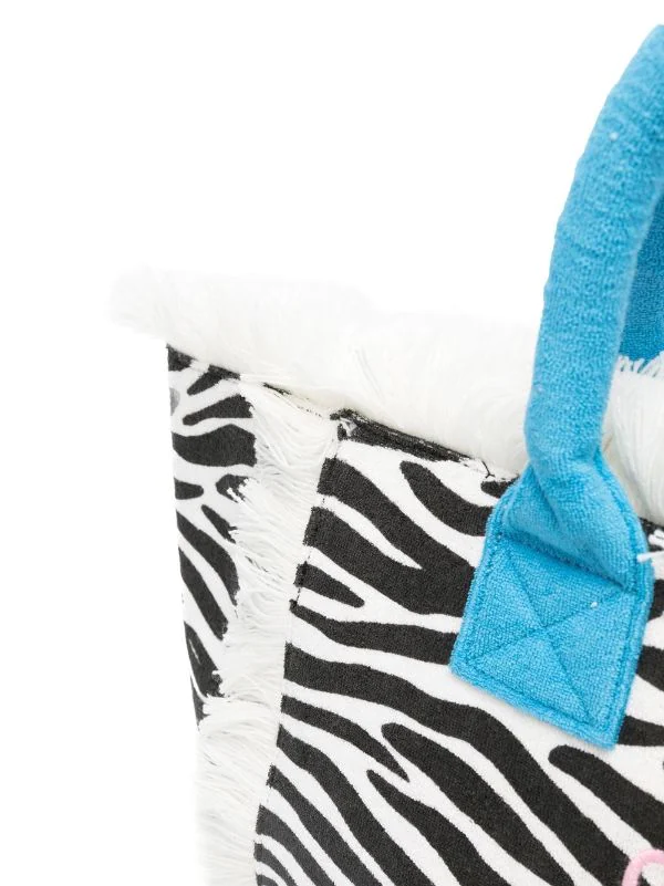 Schwarz, Weiß, Baumwolle, Zebra-Print, Logo-Stickerei vorne, runde Henkel, oben offen.