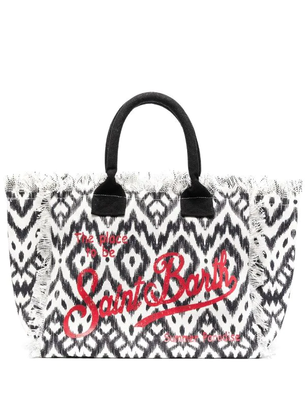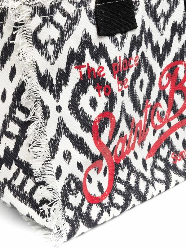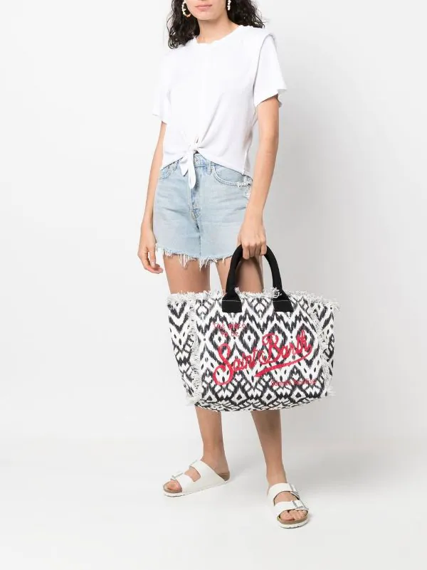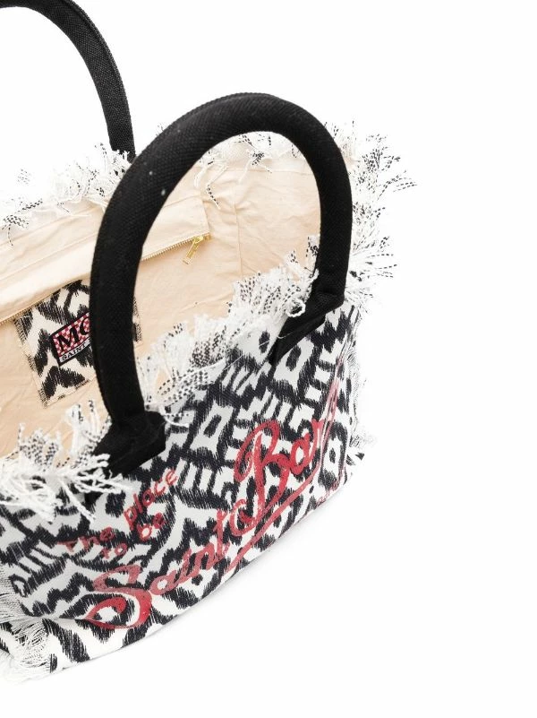 Schwarz/Weiß, Baumwolle, geometrischer Print, Logo-Print vorne, Fransen-Detail, oben offen, runde Henkel, Hauptfach.