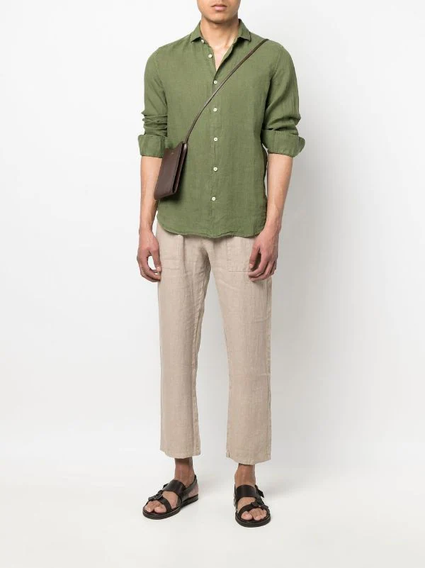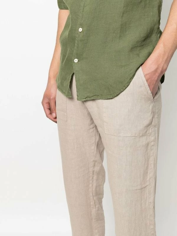 Beige, Leinen/Flachs, Logo-Patch hinten, Kordelzugbund, zwei Eingrifftaschen an der Seite, zwei Klappentaschen hinten, gerades Bein.