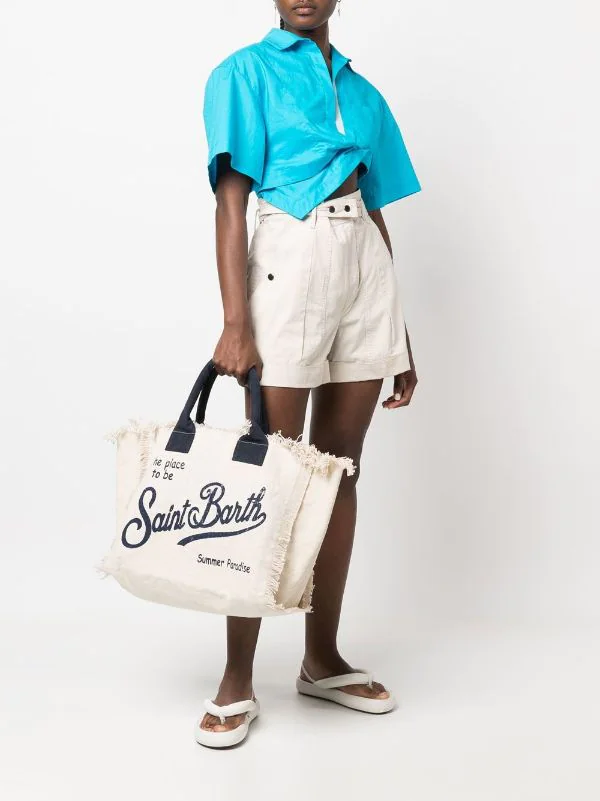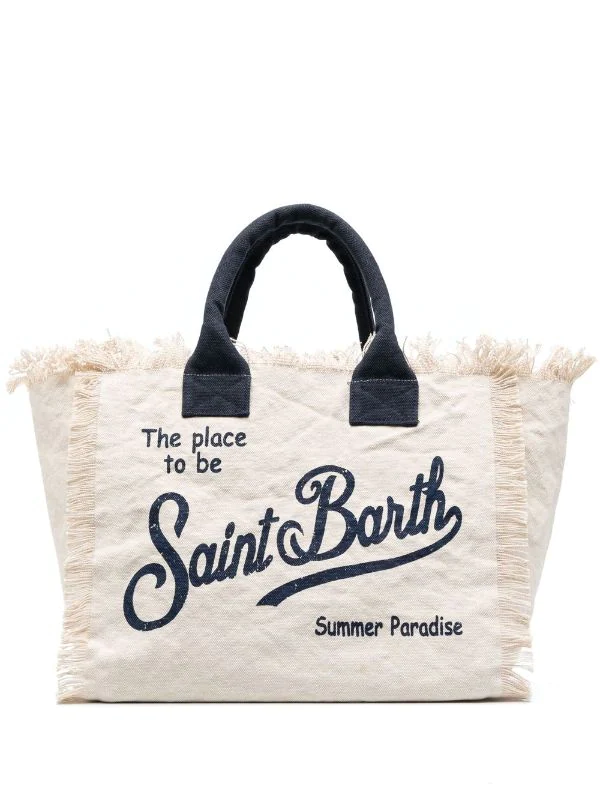 Beige, Marineblau, Baumwolle, Logo-Print vorne, runde Henkel, oben offen.