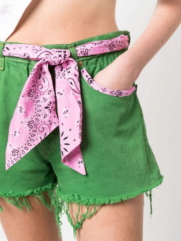 Apfelgrün, Hellpink, Baumwolle, taillenhoher Schnitt, verdeckter Verschluss vorne, zwei seitliche Eingrifftaschen, zwei aufgesetzte Gesäßtaschen, ausgefranste Kanten.