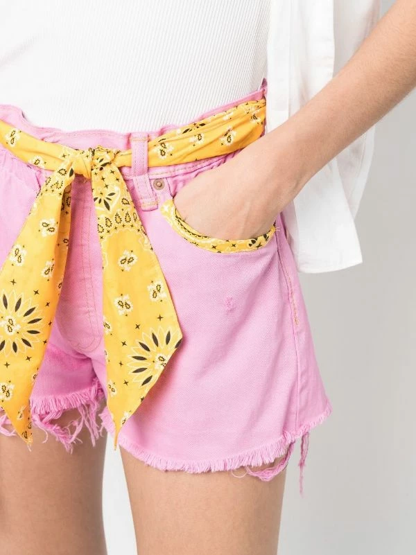 Hellpink, Bananengelb, Baumwolle, Zierband mit Paisley-Print, mittlere Taille, verdeckter Verschluss vorne, Gürtelschlaufen, Five-Pocket-Design, abnehmbarer Gürtel, Logo-Patch hinten, offener Saum, oberschenkellang.