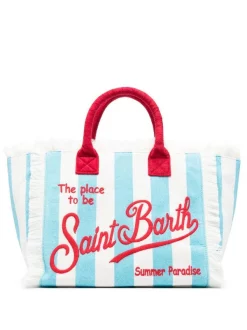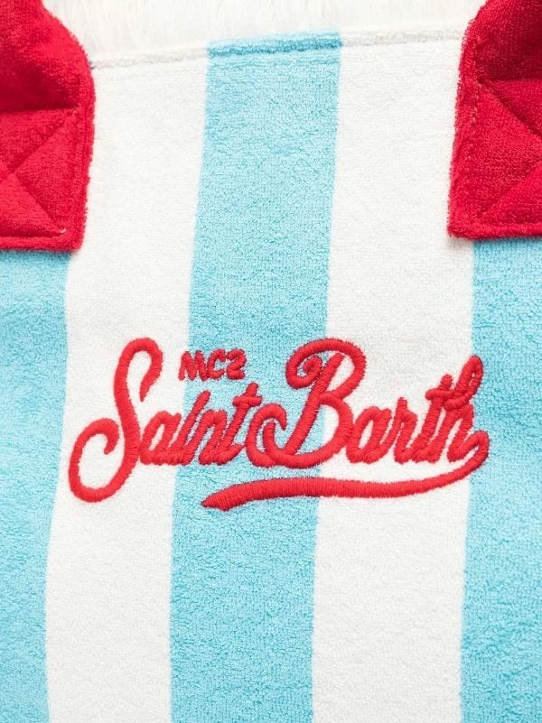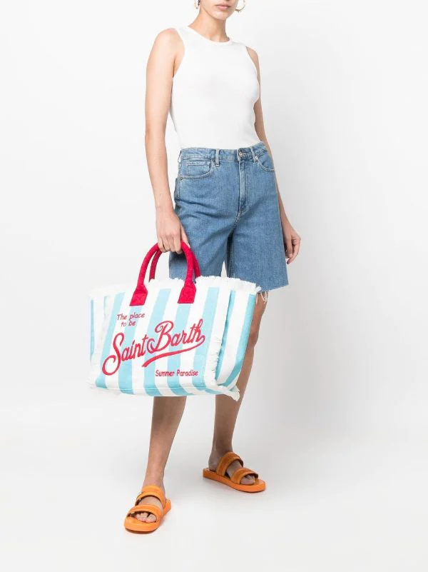 Baumwolle, Blau, Logo-Print vorne, aufgedruckte Längsstreifen, zwei Henkel, oben offen, ausgefranster Saum.