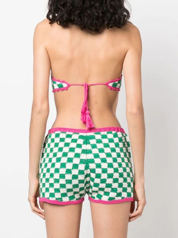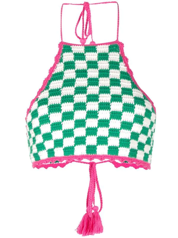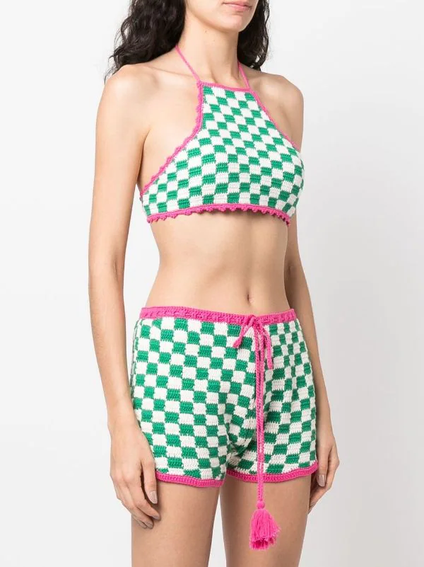 Gestricktes Design, Karomuster, Neckholder-Ausschnitt, Cropped-Design.