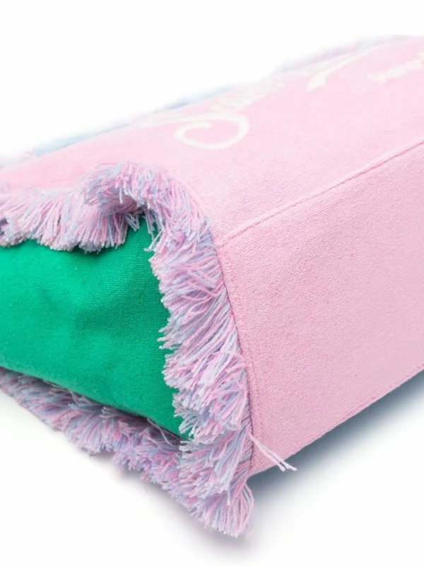 Hellpink, Blau, Apfelgrün, Colour-Block-Design, Logo-Print vorne, Fransen-Detail, runde Henkel.