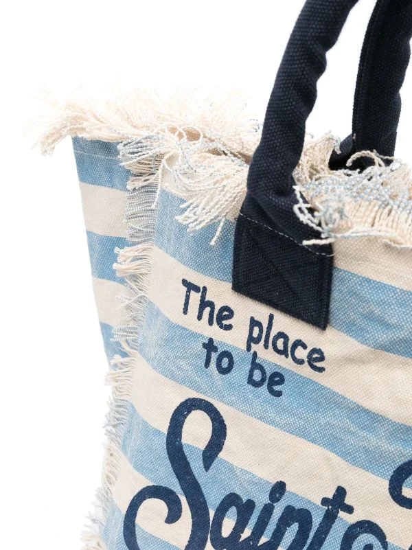 Blau, Weiß, Baumwolle, Logo-Print vorne, oben offen, runde Henkel, ausgefranste Kanten.
