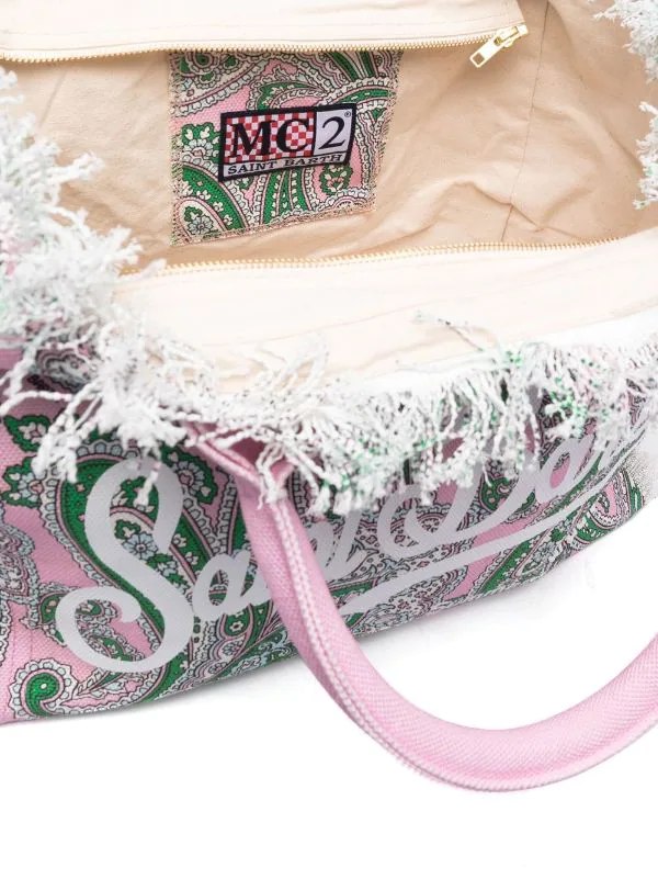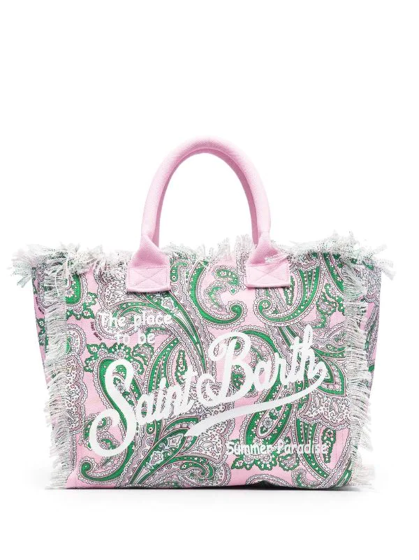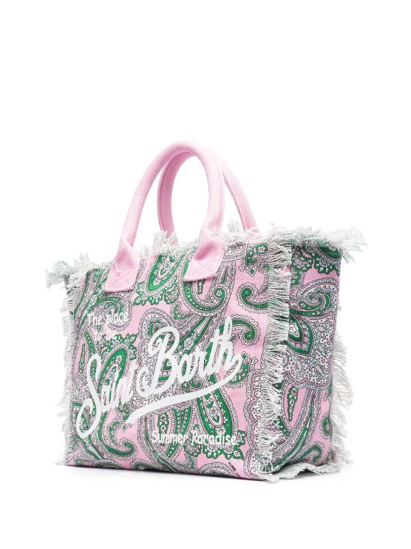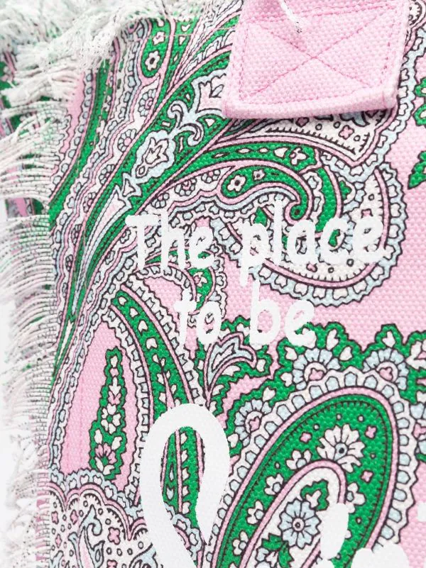 Pink, Mehrfarbig, Baumwolle, Paisley-Print, Logo-Print vorne, ausgefranster Saum, Reißverschluss oben, Hauptfach, zwei runde Henkel.