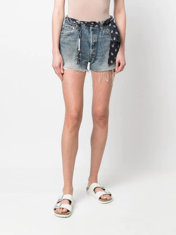 Helle Waschung, Paisley-Print, Bindegürtel, Gürtelschlaufen, Knopf- und Reißverschluss vorne, Five-Pocket-Design, gerades Bein, über dem Knie. Farbe: Blau. Material: Baumwolle.