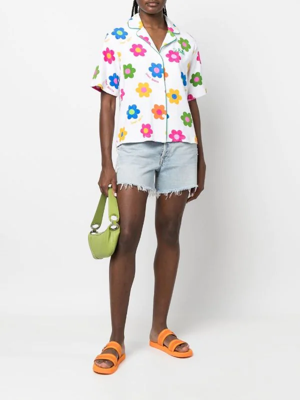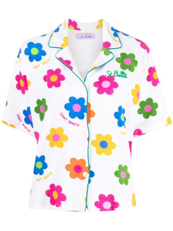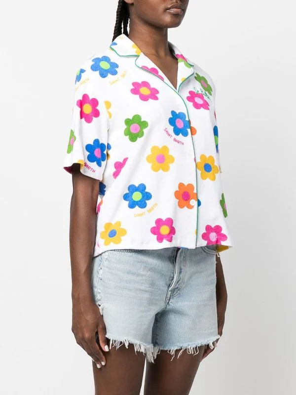 Weiß/Bunt, Baumwollgemisch, durchgehender Blumen-Print, Paspelierung, Reverskragen, Logo-Stickerei an der Brust, kurze Ärmel, gerader Saum.