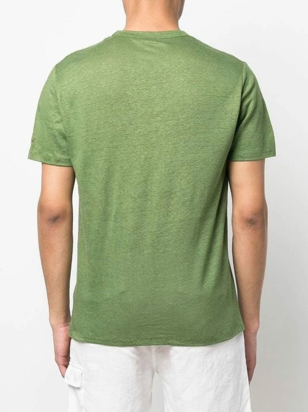 Grün, Leinen/Flachs, aufgesetzte Brusttasche, runder Ausschnitt, kurze Ärmel, gerader Saum.