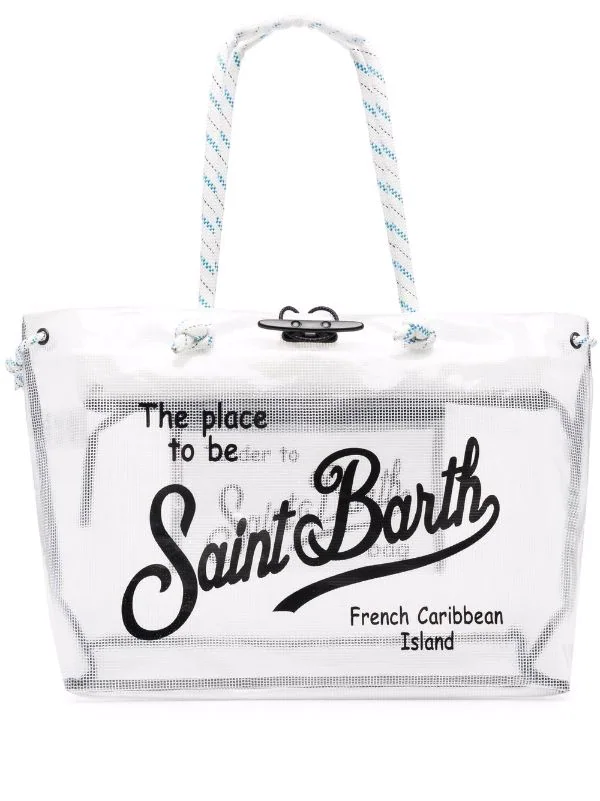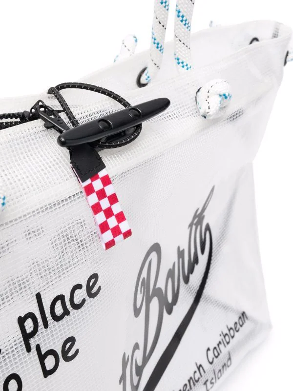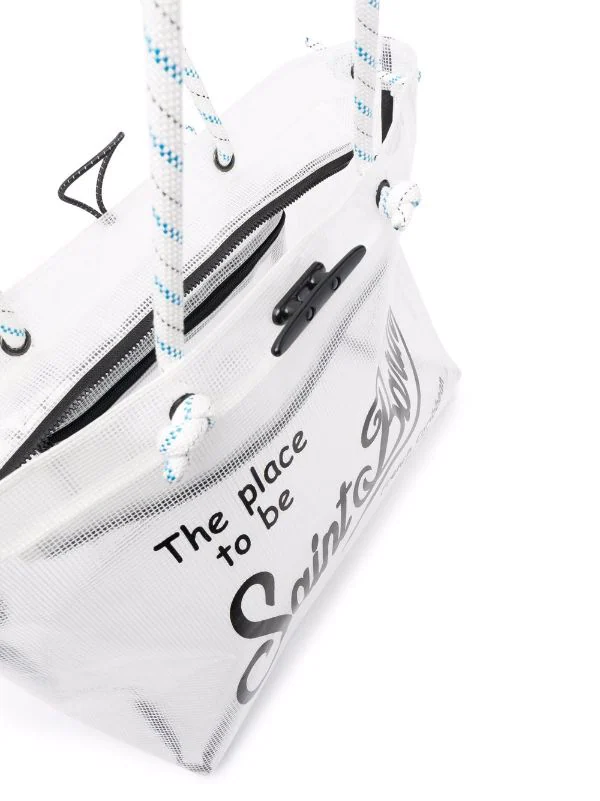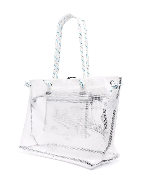Transparentes Design, geflochtene Henkel, Logo-Print vorne, Slogan-Print, Mesh-Einsätze, Knebelverschluss vorne.