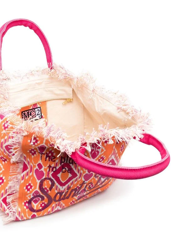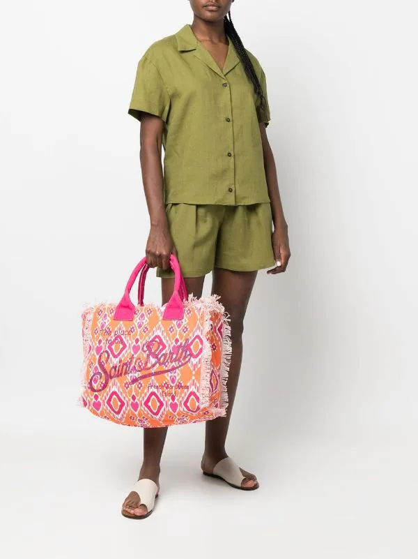 Orange, Baumwolle, geometrischer Print, Logo-Print vorne, ausgefranster Saum, zwei runde Henkel, Hauptfach.