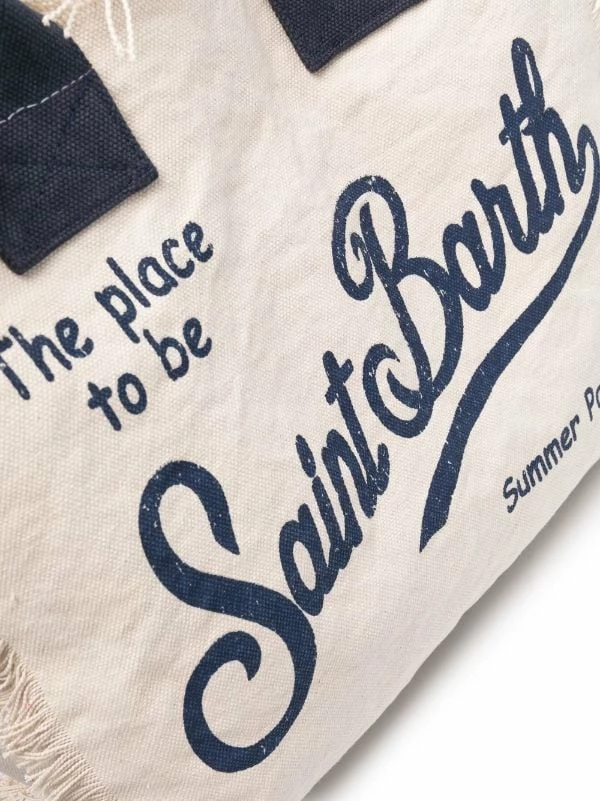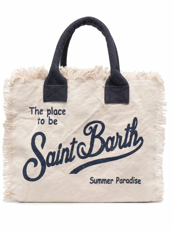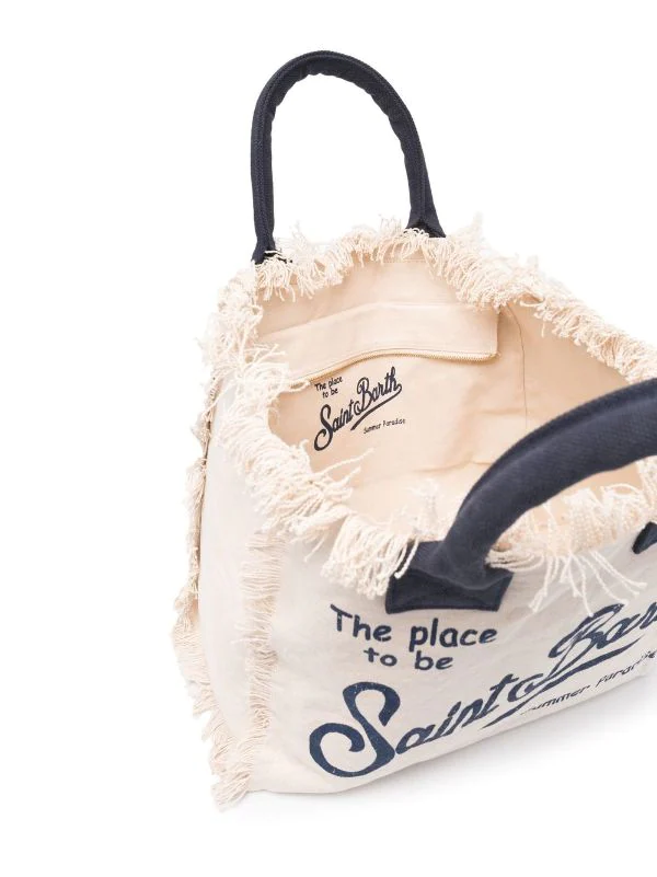 Creme, Marineblau, Baumwolle, ausgefranster Saum, Logo-Print vorne, Reißverschluss oben, zwei runde Henkel, Hauptfach.