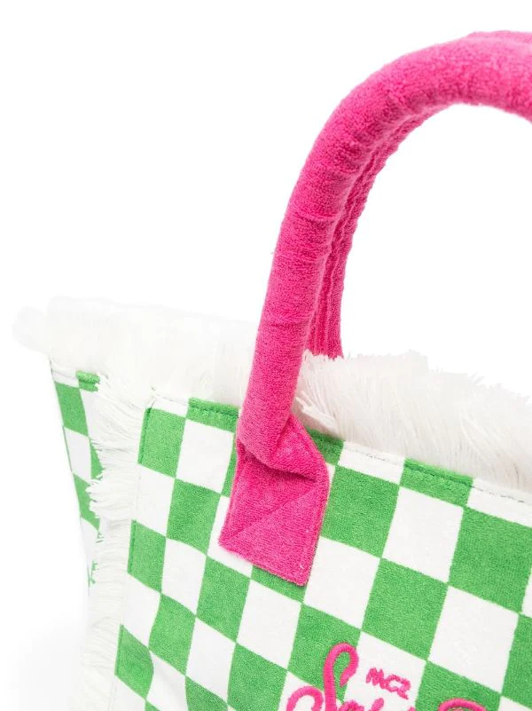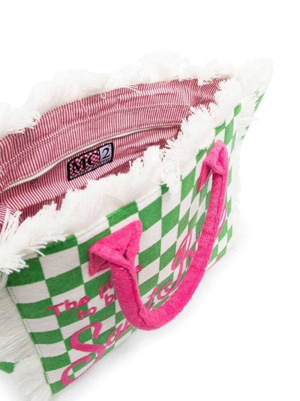 Weiß, Grün, Baumwolle, markantes Karomuster, Logo-Stickerei vorne, runde Henkel, Fransen-Detail, oben offen, Hauptfach.