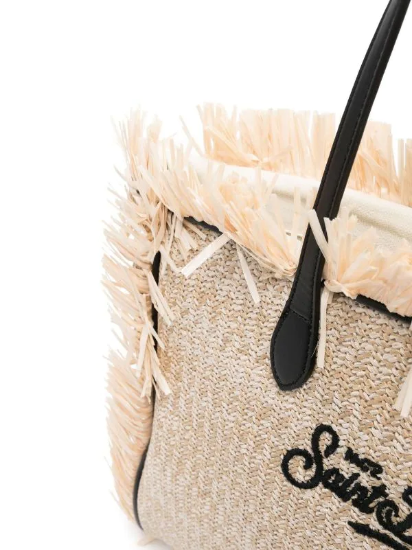 Beige, Baumwolle, Fransensaum, runde Henkel, Logo-Stickerei vorne, mit Webmuster, oben offen, Hauptfach.