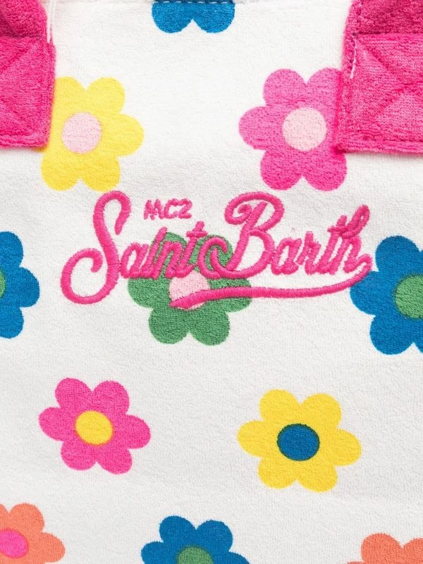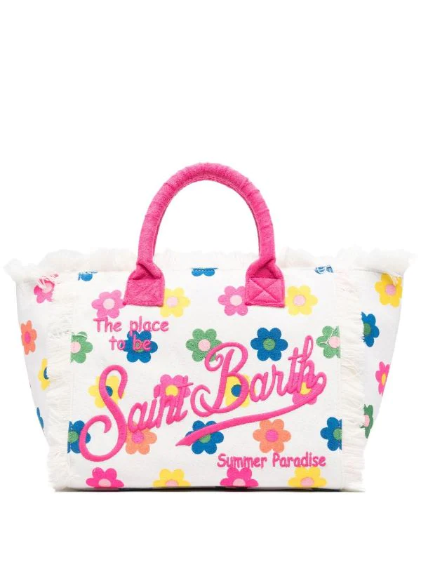 Weiß, Hot Pink, Baumwolle, kleinflächiger Blumen-Print, Logo-Stickerei vorne, runde Henkel.