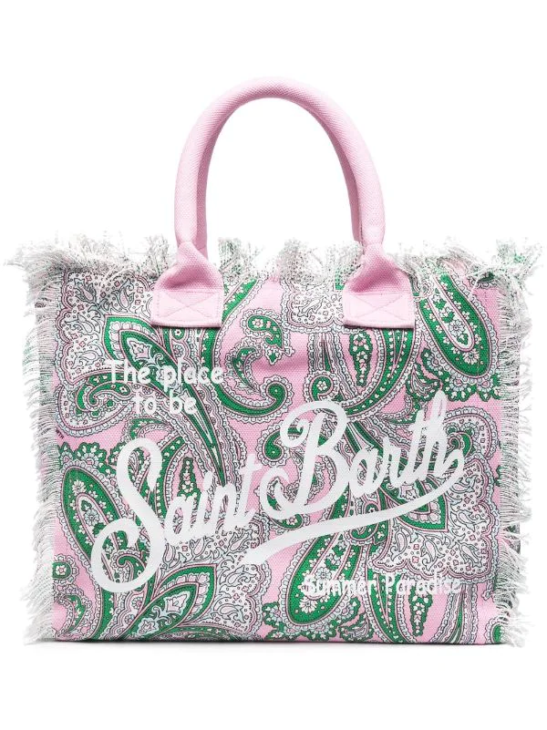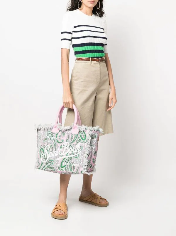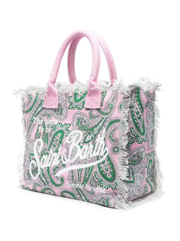 Baumwolle, Hellpink, ausgefranste Kanten, oben offen, zwei Henkel, Logo-Patch vorne.