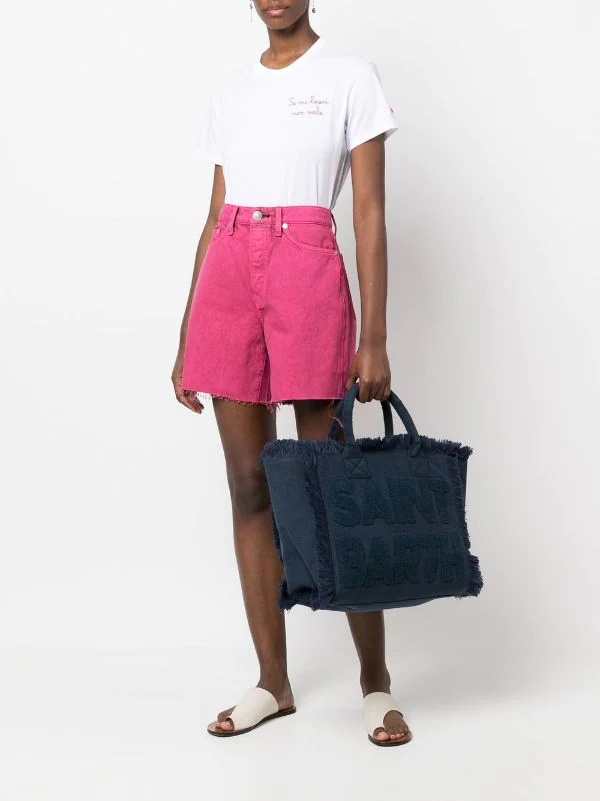 Marineblau, Baumwolle, Logo-Print vorne, aufgesticktes Logo hinten, ausgefranster Saum, zwei Henkel, Hauptfach.