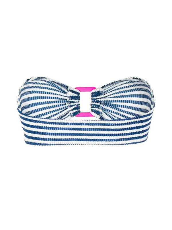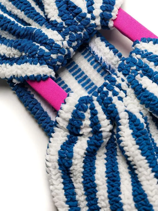 Blau, Weiß, Pink, Stretch-Design, Seersucker-Muster, aufgedruckte Querstreifen, Bandeau-Style, Rüschen. Swimwear kann nur über Ihrer eigenen Unterwäsche anprobiert werden. Taucherbrille und Schnorchel sind optional….